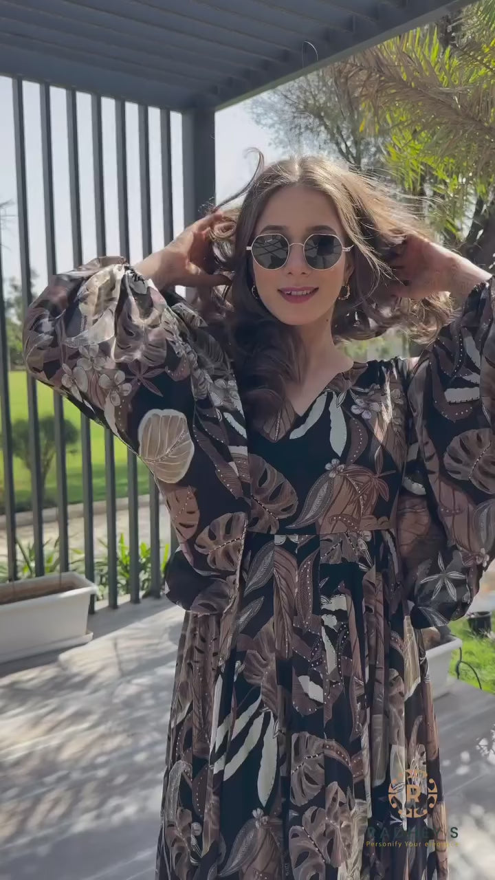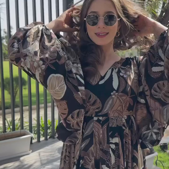 Black Leaf Print Maxi Dress – Elegant Flared Gown with Bell Sleeves for Women